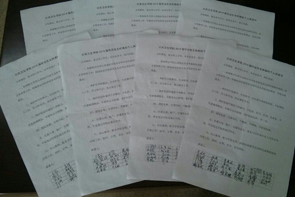 签订文明离校协议书 学院在2014届毕业生中发起了文明离校的倡议,得到了毕业生的积极响应。同学们们纷纷签订了文明离校协议书,有力地促进了毕业生的文明离校、有序离校,为校园毕业季增添了一抹光辉。
