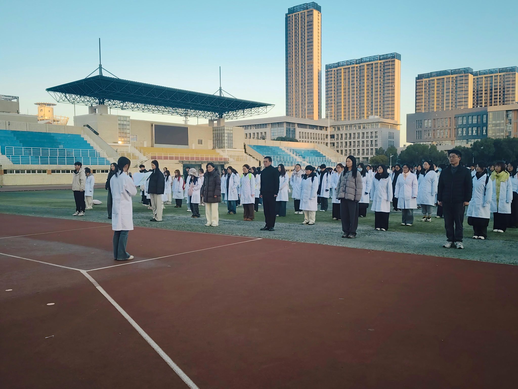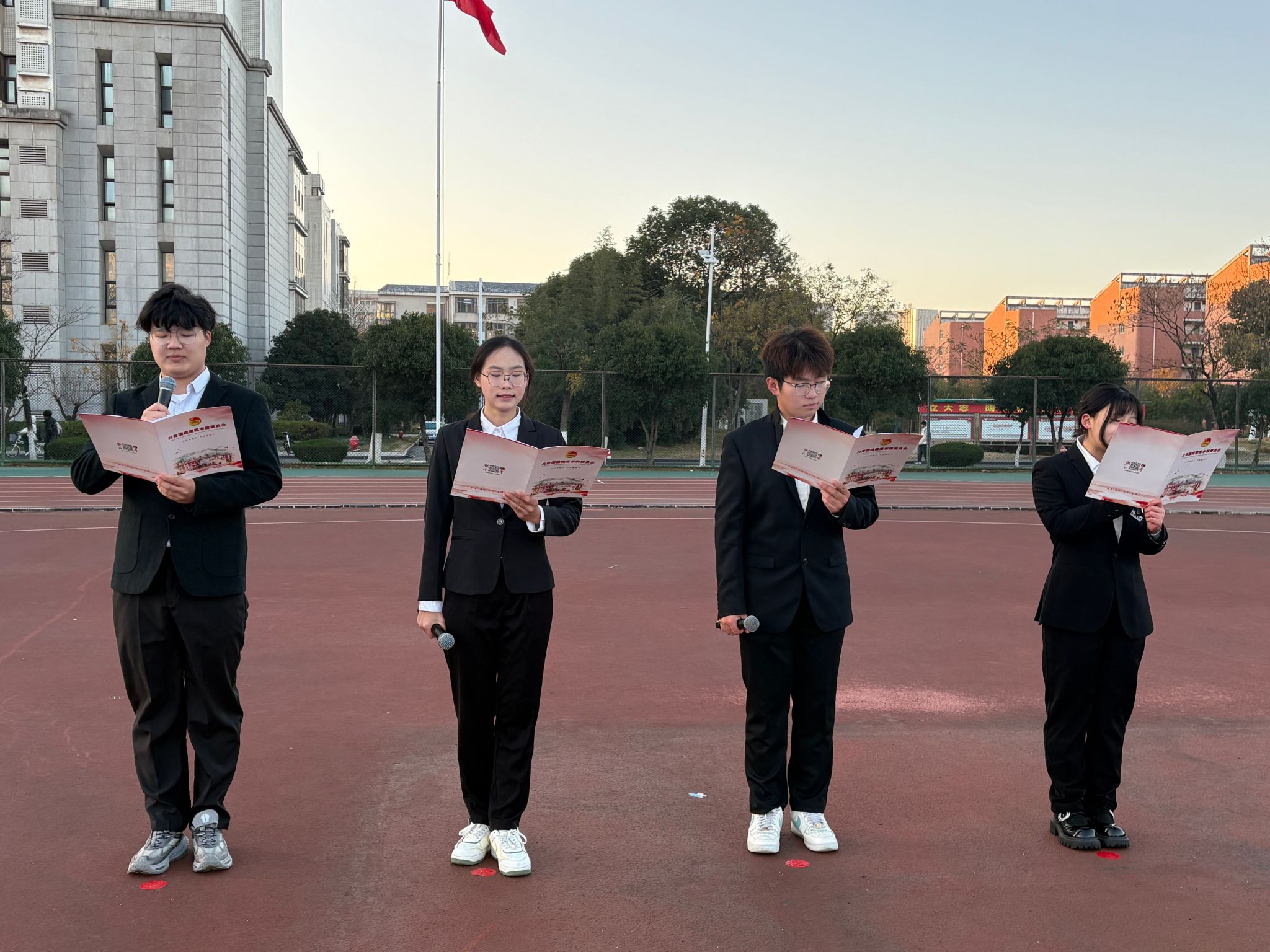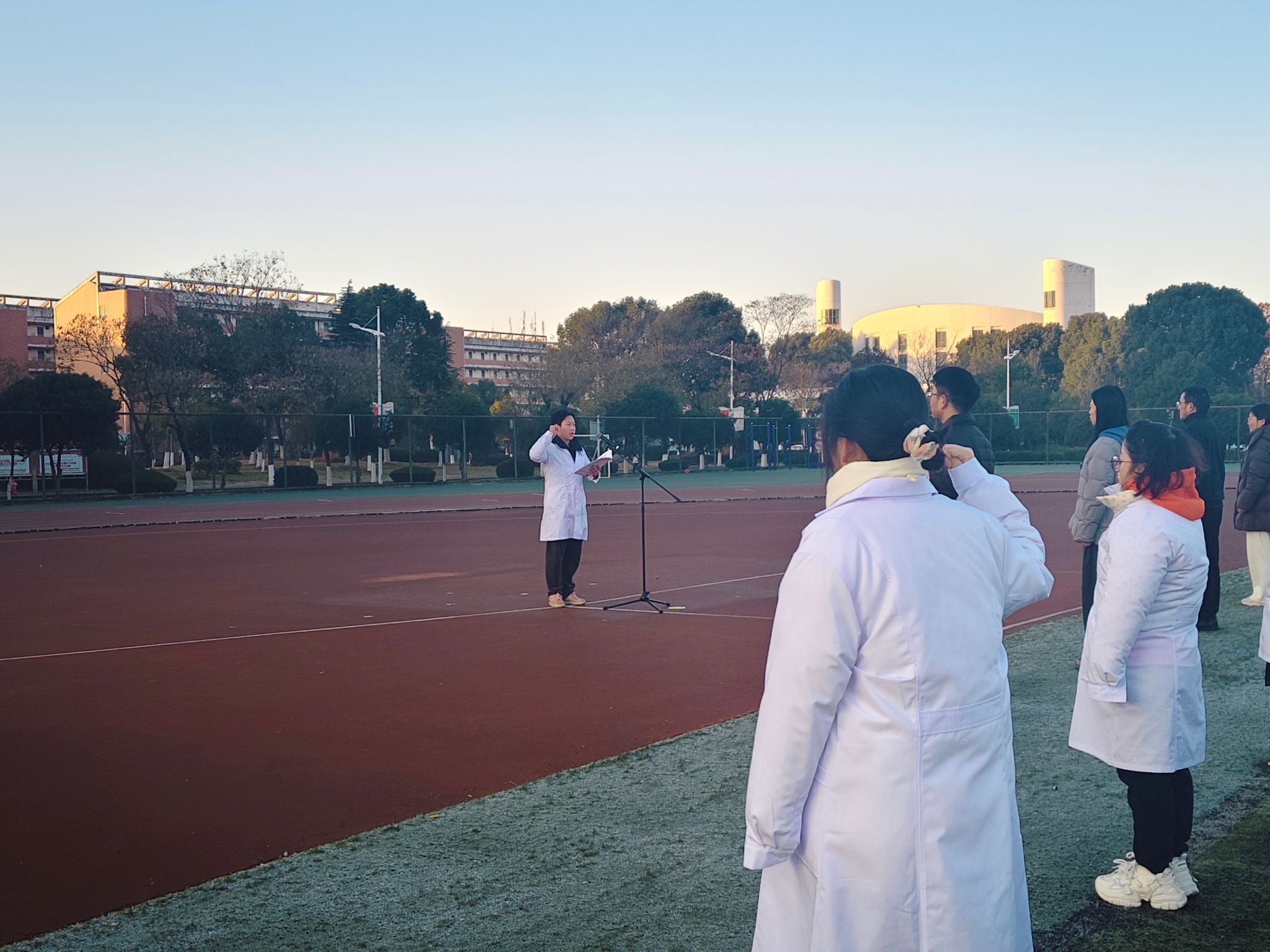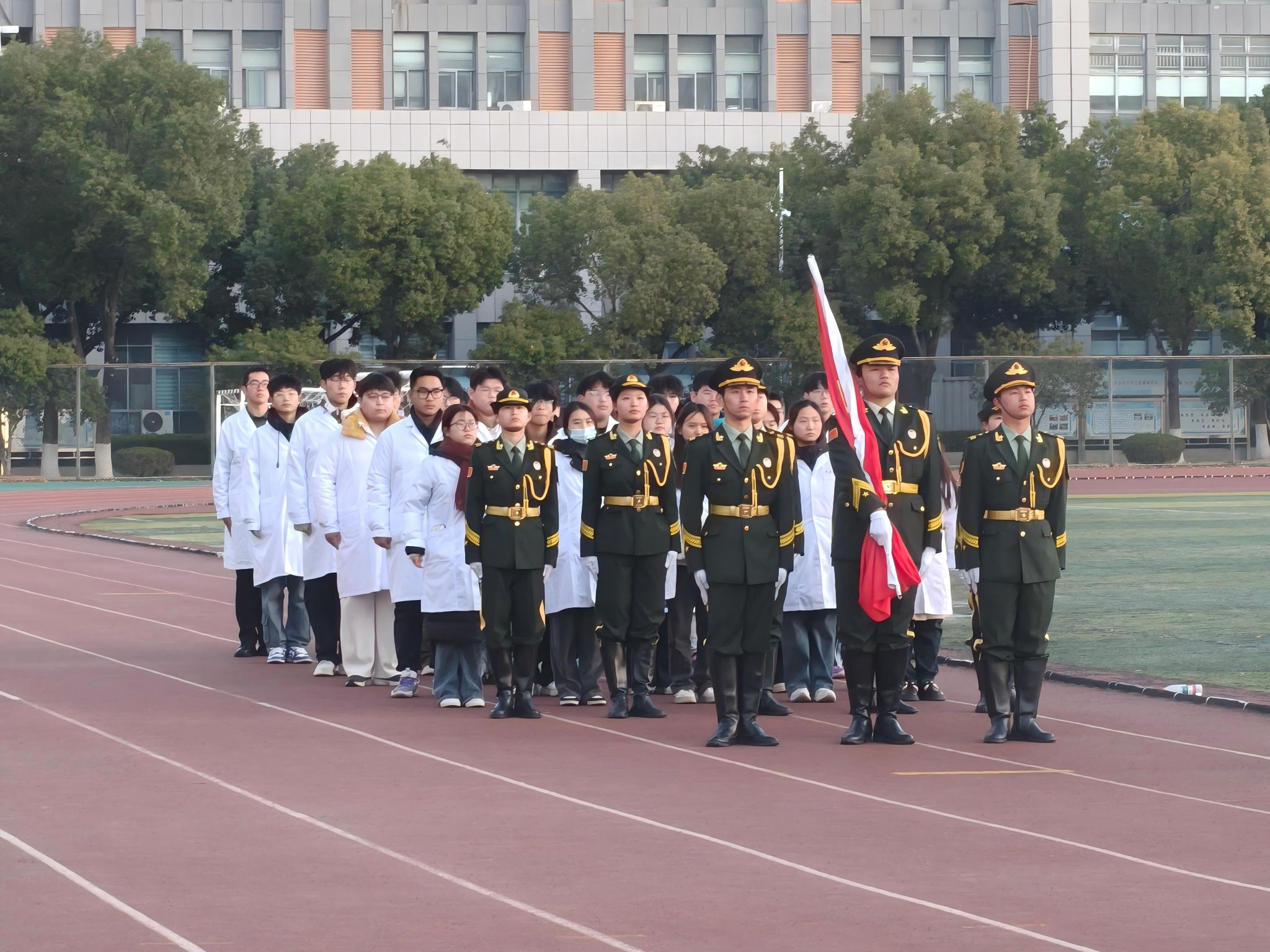 随后,四名新生代表深情朗诵《烽火八十载,诗魂照千秋》,带领师生重温历史,弘扬伟大抗战精神,凝聚奋进力量。朗诵毕,活动迎来高潮——全体新生身着白衣,高举右拳,庄严宣誓,表达了献身医学、服务人民的坚定决心。最后,全体师生齐声奏唱校歌,风中飘扬的国旗与嘹亮的歌声交融,传递出对学校的热爱与师生团结前行、共创未来的信念。